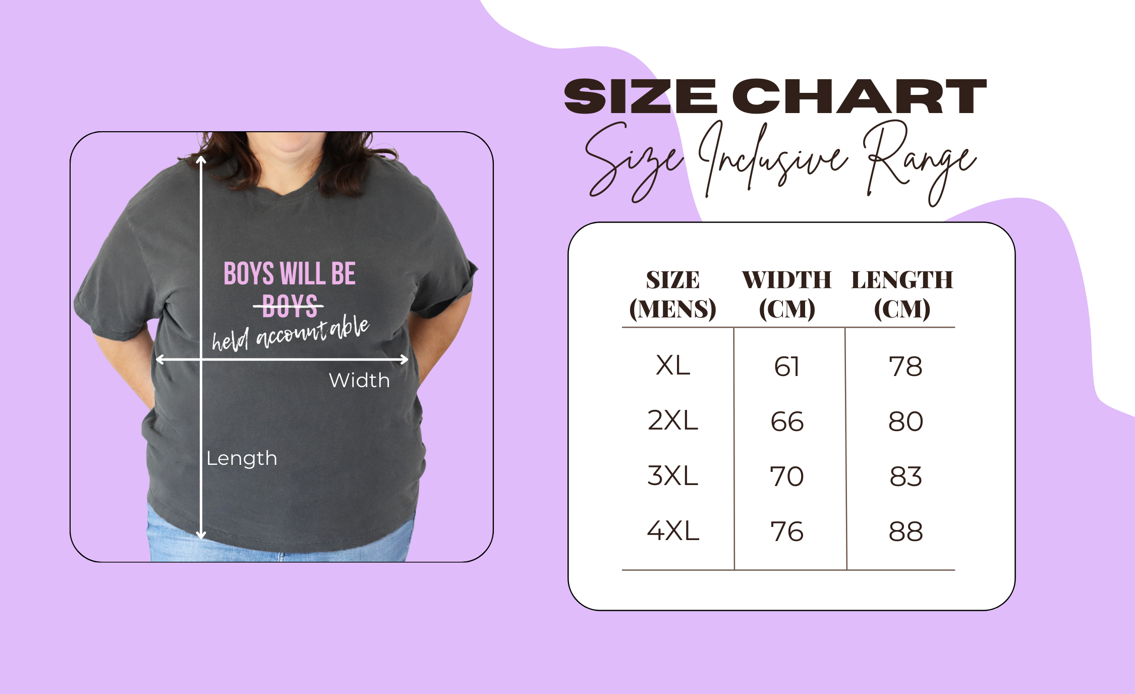Size Inclusive T-Shirt Range are made with Comfort Colours and American Apparel Men's/Unisex Tees. See specific size guide below.